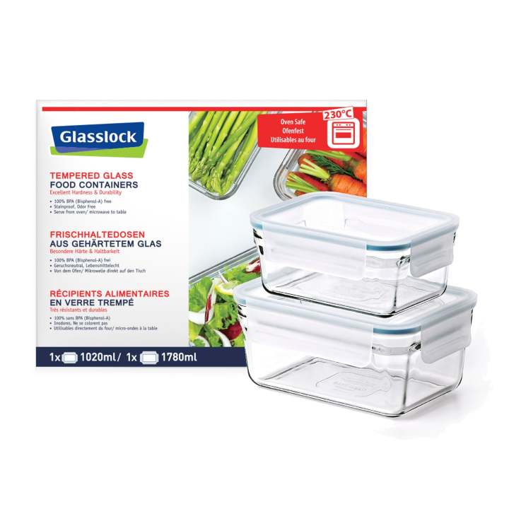 Lote de 2 recipientes herméticos rectangulares de 1020 y 1780 ml Glasslock Oven Safe fabricados en vidrio sódico-cálcico, un material muy resistente, ecológico y reciclable. Además están libres de BPA y no contienen ningún producto dañino para el medio ambiente.