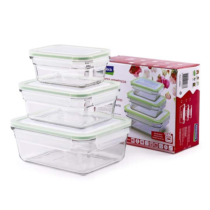 Lote de 3 recipientes herméticos rectangulares de 480 ml, 970 ml y 1730 ml Glasslock Oven Safe fabricados en vidrio sódico-cálcico, un material muy resistente, ecológico y reciclable. Además están libres de BPA y no contienen ningún producto dañino para el medio ambiente.