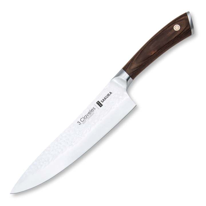 Cuchillo profesional 3 Claveles Sakura ref. 1019, con hoja forjada martilleada en Acero Inoxidable 3Cr13 de dureza Rockwell HRC57. Mango de madera de Pakka, resistente al calor y la humedad. Ligero de filo liso y punta estable.