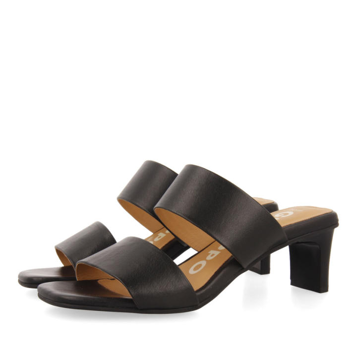 En verano no renuncies al estilo. Sandalias de piel color negro con tacón de 5 cm y doble tira. La plantilla es de piel muy acolchada con látex. El forro también es de piel y el piso flexible. No te pierdas la nueva colección de sandalias de tacón para mujer en la nueva colección de Gioseppo Woman.