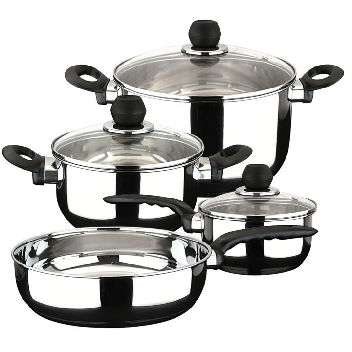 Composición: Olla alta con tapa de 24 cm: 24 x 13,5 cm. (diámetro x altura) 6.1L. Olla alta con tapa de 18 cm: 18 x 9 cm. (diámetro x altura) 2.2L. Cacerola con tapa de 16 cm: 16 x 8 cm. (diámetro x altura) 1.6L. Sartén de 24 cm: 24 x 6,5 cm.