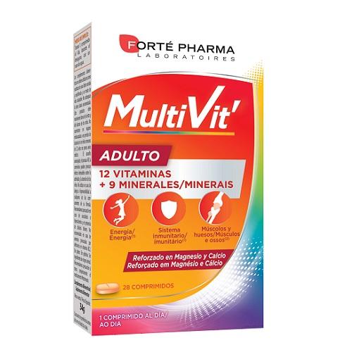 Multivit Adulto es un complejo multivitamínico (12 vitaminas + 9 minerales y oligoelementos reforzado en calcio y magnesio) desarrollado para aportar forma y tono. La fórmula de Multivit Adulto aporta: