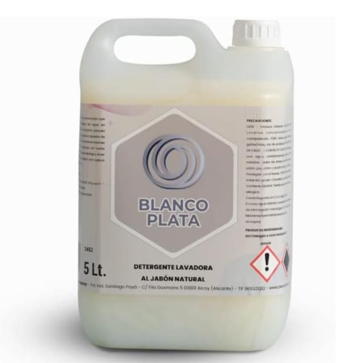 El detergente para lavadora al jabón natural Blancoplata de 5l destaca por su contenido en jabones naturale que protege los tejidos, sus enzimas son capaces de eliminar cualquier resto de comida y las manchas más difíciles. Los blanqueantes ópticos devuelven el blanco original y reavivan los colores de la ropa. De agradable perfume a jabón de marsella.