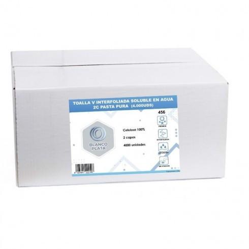 Toalla engarzada plegada en V con 2 capas de pasta pura Blancoplata. Soluble en agua. Caja con 4000 toallas distribuidas en 20 paquetes individuales.