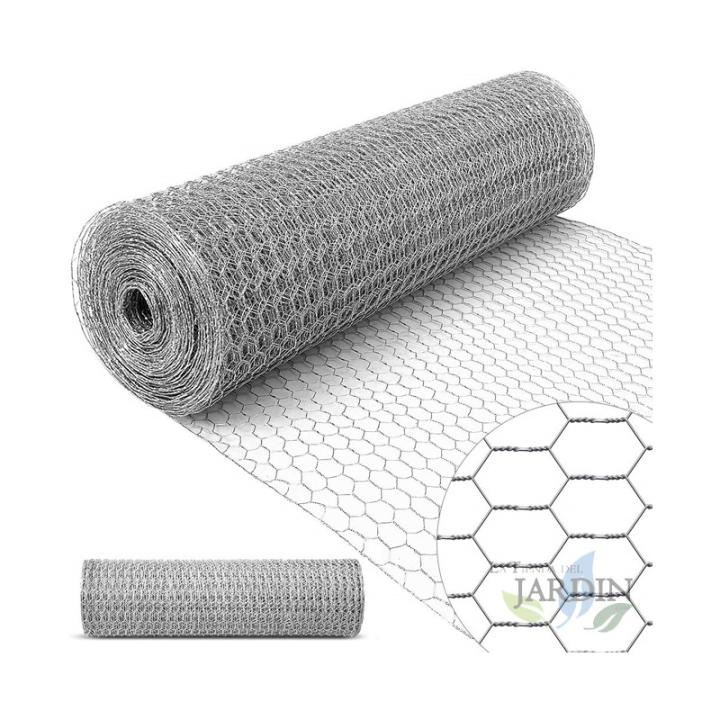Malla metálica hexagonal de alambre 0,7mm. Tamaño del agujero 41mm. Destinadas al uso avícola y agrícola: cercados, jaulas, huertos, plantas, etc. Así como para la creación de recintos para animales cautivos; o como barreras de protección para impedir el acceso de roedores en huertos y plantas. Medida bobina: 0,5 x 10 metros.
