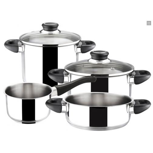 COMPOSICIÓN: Cacerola 24 cm: 24 x 11 cm. (diámetro x altura). Capacidad: 5 L. Olla 20 cm: 20 x 11 cm. (diámetro x altura). Capacidad: 3.5 L. Cazo 14 cm: 14 x 7,5 cm. (diámetro x altura). Capacidad: 1.1 L. Tartera 24 cm: 24 x 7 cm. (diámetro x altura). Capacidad: 3.2 L.