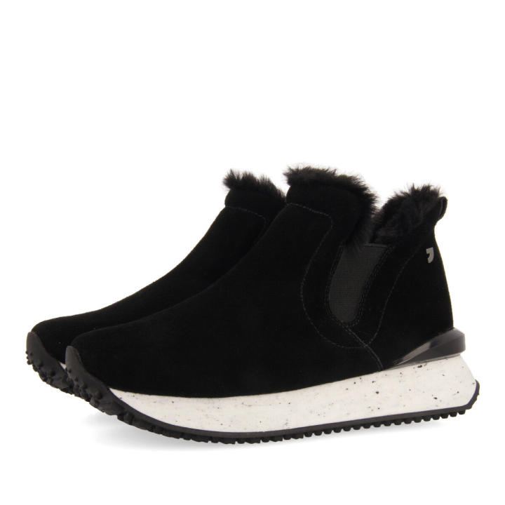 El favorito de la temporada. Sneakers tipo botín estilo chelsea negras con detalle de pelo. Planta de materiales reciclados, forro acolchado y transpirable y suela de goma reciclada. Cuenta con elásticos para facilitar el calce. Suela de 3,5 cm.¡No te quedes sin ellas!
