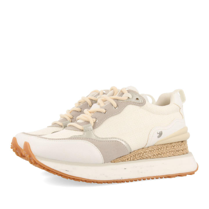 Sneakers blancas de rafia con cuña externa forrada en yute. Piso de EVA reciclada. Cuña de 6 cm. Planta y forro acolchado y transpirable de poliéster reciclado. Los básicos que no pararás de ponerte están en Gioseppo Woman.