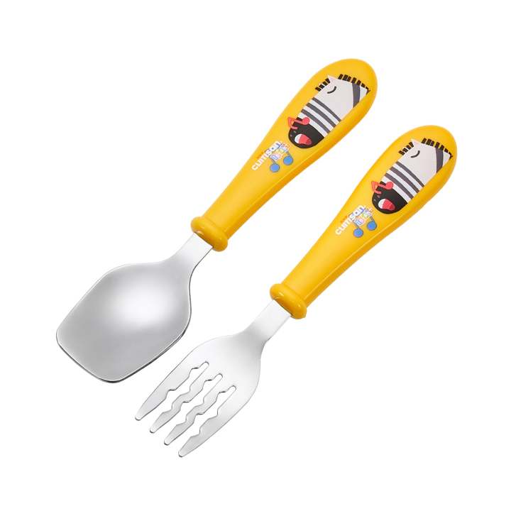Incluye una cuchara y un tenedor y están especialmente diseñados para los más pequeños: el tenedor tiene forma en zig-zag que ayuda a prevenir que la pasta se resbale, mientras que la cuchara cuadrada está diseñada para poder recoger bien la comida del fondo del bol o bandeja más fácilmente.