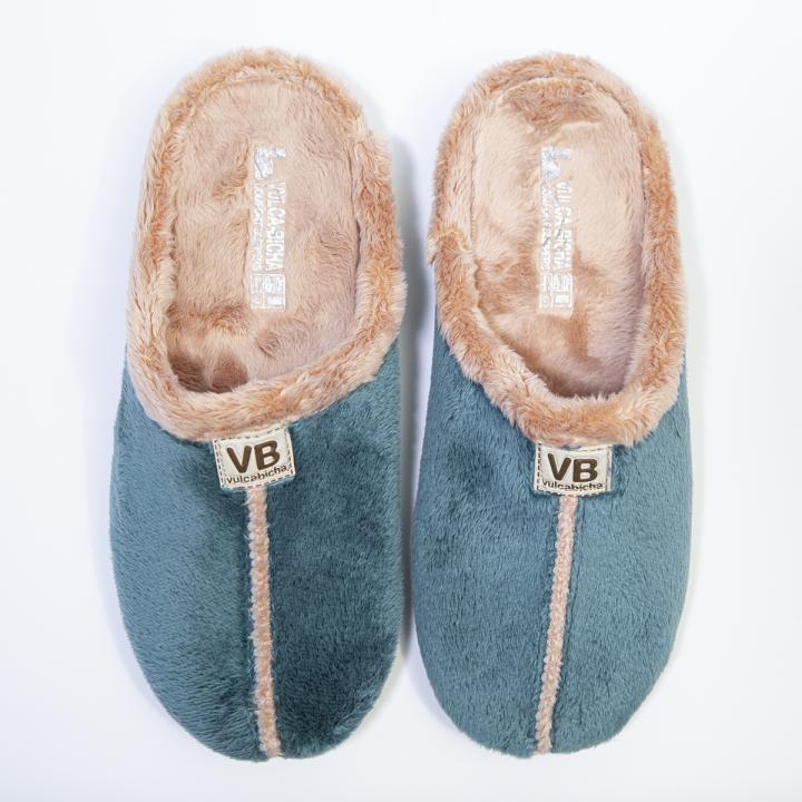 Zapatilla de casa para mujer destalonada modelo 4311 de la marca Vulca-Bicha fabricada en un tejido cálido y suave de suapel con ribete en contraste. Su suela es de goma muy flexible, antideslizante y tiene plantilla acolchada extraíble. Fabricado en España