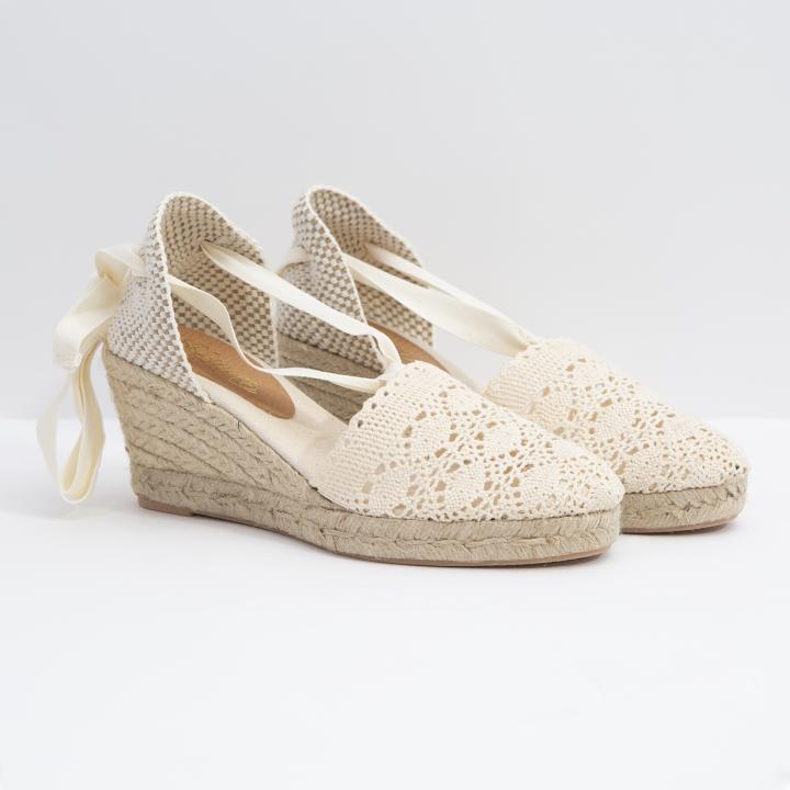 Alpargatas de cuña elaborada en tejido de crochet beige, volviendo a sucumbir ante la técnica manual del ganchillo que adoraban nuestras abuelas. Su cierrre es mediante cintas largas de algodón al tono que se cruzan y atan al tobillo. La planta está forrada de lona de algodón y su suela es de yute natural con una altura de 7 cm. con piso de goma antideslizante para poder caminar sin problemas. Fabricado en España.