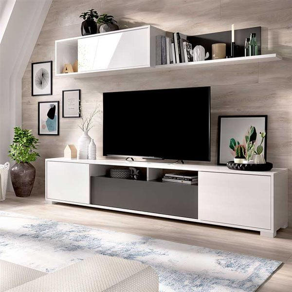 La composición de salón Ken es una opción ideal para completar tu salón o comedor y convertirlo en el escenario perfecto para tus momentos de descanso frente al televisor. Está formada por un elegante mueble de TV y un módulo superior que en conjunto crean un espacio práctico y con estilo. El mueble de TV dispone de dos puertas batientes, una puerta central abatible y dos huecos abiertos perfectos para colocar tus dispositivos electrónicos. Los compartimentos ocultos tras las puertas son muy espaciosos y resultan ideales para guardar y organizar todo tipo de objetos. El módulo superior incluye una puerta abatible, un estante amplio para libros o elementos decorativos y un pequeño compartimento abierto que aporta un toque distintivo y sofisticado al conjunto.