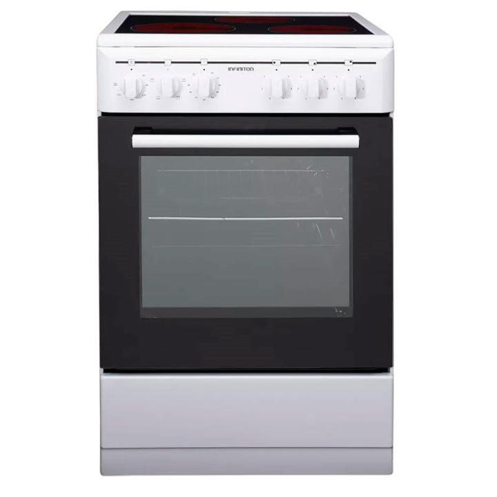 La cocina eléctrica modelo CC-V350G de la marca Infiniton se caracteriza por contar con placa vitrocerámica de 3 fuegos con 6 niveles de potencia por zona y horno eléctrico con capacidad de 48L. El horno viene con puerta de doble acristalamiento y 4 funciones: calentador superior, calentador inferior, calentador convencional y grill. También cuenta con temporizador mecánico de 0 a 90 minutos e incluye 1 bandeja y 1 rejilla. La potencia total entre el horno y la placa vitrocerámica es de 5915W. Viene en color blanco con detalles en negro y sus patas son regulables en altura.