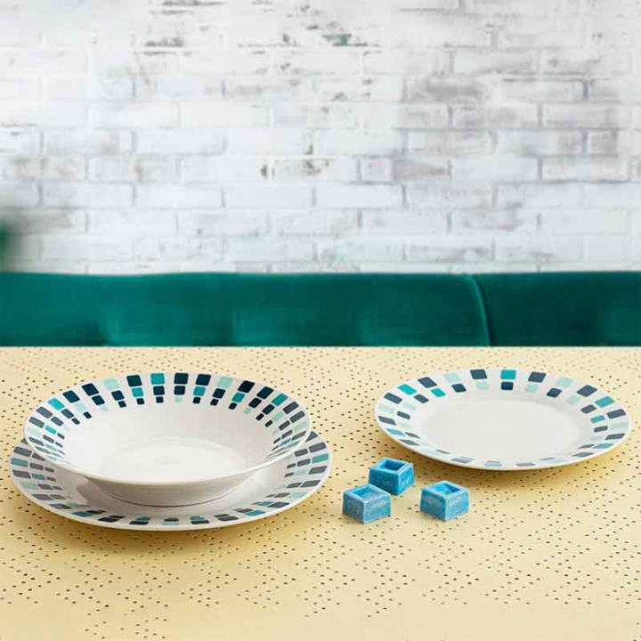 Viste tu mesa sirviendo tus comidas en la estilosa vajilla modelo Simetric de la marca Quid. Tiene una capacidad de 6 servicios y cuenta con 18 piezas de porcelana en color blanco con un bonito diseño a cuadros en tonos azules en el borde: 6 platos llanos de Ø23 cm, 6 platos hondos de Ø20 cm y 6 platos de postre de Ø19 cm. Sus acabados de alta de calidad y los materiales de los que está fabricada la hacen muy resistente al uso diario. Además, todas las piezas son aptas para lavavajillas y microondas. Una vajilla con un estilo divertido y diferente que no puede faltar en tu menaje de mesa.