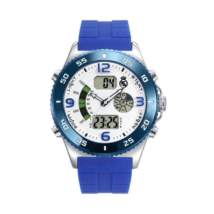 Reloj Oficial del Real Madrid analógico-digital para hombre. Caja de acero inoxidable plateado, bisel azul, dial blanco, agujas e índices azules, multifunción y correo de goma azul. Presentado en estuche.