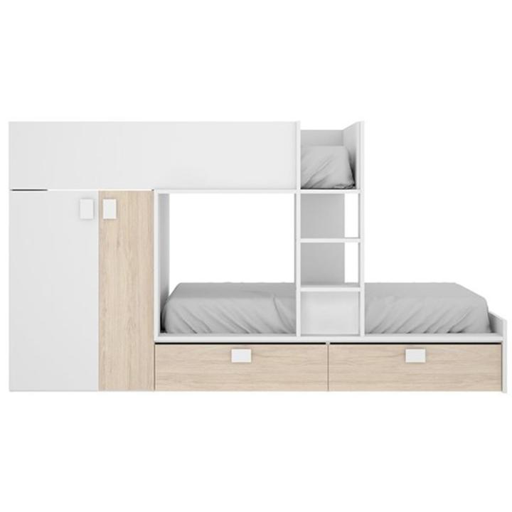 Esta fantástica cama modelo Matt Tren tiene capacidad para 2 niños y consta de un armario con barra y estante y 2 cajones con ruedas que te permitirán guardar todo tipo de objetos. Está fabricada con tablero de partículas melaminizado de alta calidad y viene con tiradores de ABS, tacos quitarruidos y antirrayaduras y ruedas unidireccionales de Nylon en los cajones. Los herrajes son resistentes y muy duraderos lo que garantiza una estructura sólida y consistente. La cama superior no está indicada para niños menores de 6 años y ninguna de ambas camas necesita somier. Además, el montaje es reversible, lo que permite colocar el armario a izquierda o derecha según la distribución de la estancia donde decidas colocarla. Sus finas líneas, su compacto diseño y sus colores combinarán a la perfección aportando un aire fresco y moderno al dormitorio.