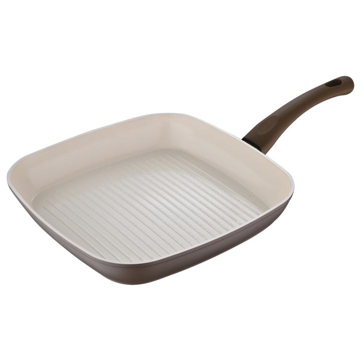 Cuida cada detalle en tu cocina con la sartén grill Natur. Cocina recetas de estilo barbacoa con la sartén grill de 28 cm fabricada con aluminio forjado que distribuye el calor desde el centro de la sartén hasta los bordes de manera eficiente para un cocinado completo sin puntos calientes. El interior posee un revestimiento antiadherente de gran liberación para cocinar con menos aceite y que evita la adhesión de la comida para un cocinado sin sustancias tóxicas. La base de inducción es apta para su uso en cualquier placa de cocina y su diseño en color crema en el interio conjugado con el color marrón chocolate del exterior dará un toque cálido a tu cocina. Agarra la pieza de manera segura y firme con su mango ergonómico de tacto suave y límpiala sin apenas esfuerzo. Se recomienda lavar a mano para extender la vida útil del producto.