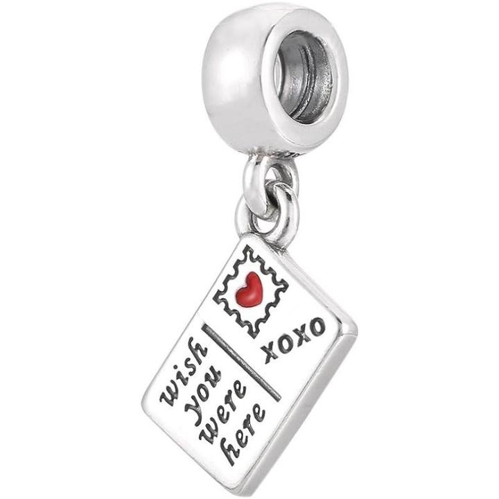 La Dangle de Pandora en tarjetas postales de diseño es adornado con rojo y azul esmalte. en el un lado tiene un grabado con las palabras Wish You Were Here y en el otro lado es el francés Bon Jour de felicitación a leer. también son allí los contornos de la Torre Eiffel grabado el cerdo tiene un ojete con la que puede ser fácil de llevar a pulseras o cadenas. la base del Decoración colgante es de plata 925.