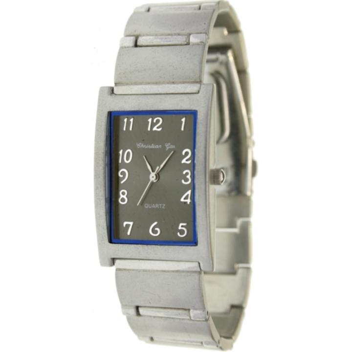 · Esfera rectangular color negra con borde metalizado con bisel interior azul. Números árabes y saetas plateadas,