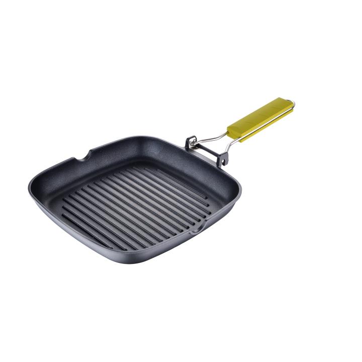 Sartén asador de 24x24x3,7 cm perteneciente a la colección Safari de United Colors of Benetton. Dale color a tu cocina y disfruta de una cocina saludable esta sartén asador fabricada en aluminio fundido, un material de gran calidad y con alta retención de calor para cocinar con ahorro de energía. Gracias a su revestimiento antiadherente podrás asar carnes, pescados y verduras con menos aceite y sin que los alimentos se peguen a su superficie. Por otro lado, su base de inducción por puntos te permitirá cocinar donde lo necesites ya que es apta para cocinas eléctricas, halógenas, vitrocerámicas, de gas y de inducción. La sartén grill cuenta también con dos picos para facilitar el escurrido y un mango plegable en color verde para guardarla fácilmente. La sartén no es apta para lavavajillas. Se recomienda lavar a mano: pasar una esponja humedecida con jabón suavemente por su superficie y aplicar abundante agua.