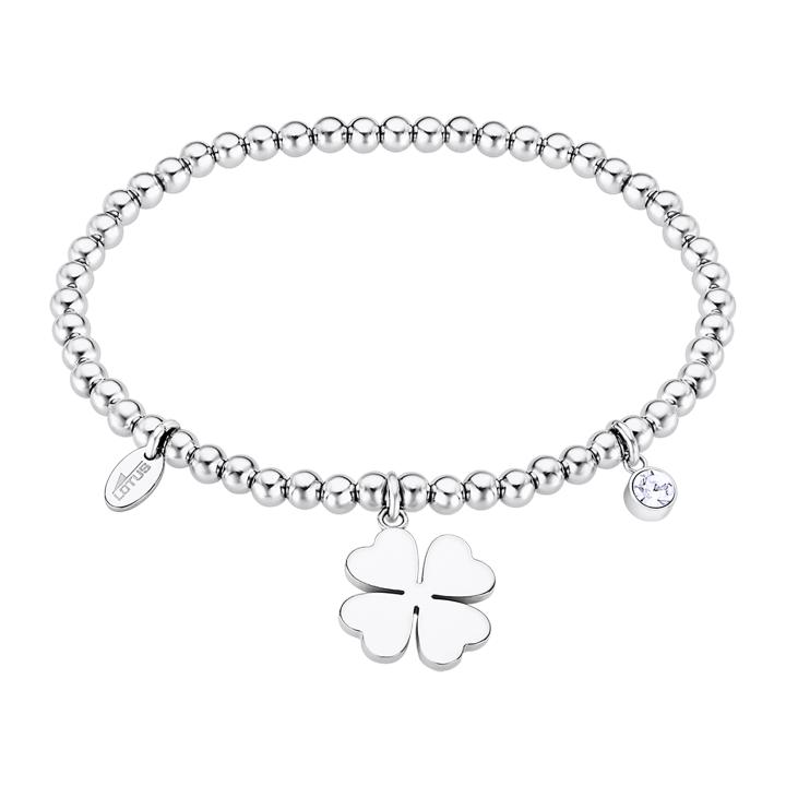 Pulsera fabricada en acero de bolitas con detalle de trébol y circonita. Ref. LS2170-2/1 colección Millenial. Pulsera elástica de unos 6 cm de diámetro. Se incluye estuche oficial Lotus Style.