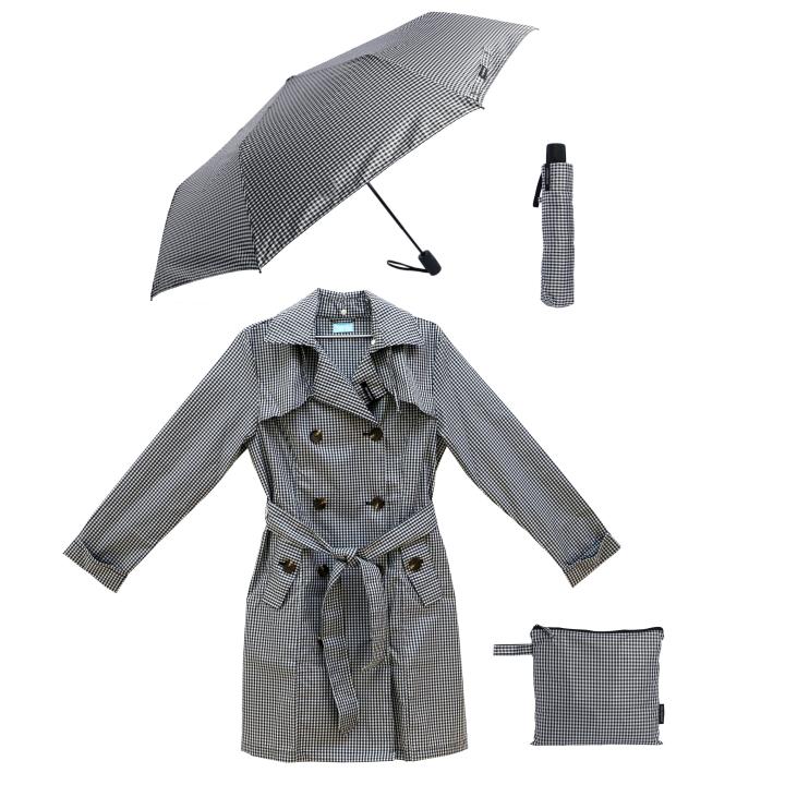 Paraguas plegable fabricada en poliéster de gran calidad, con estructura de fibra de vidrio compuesta con 8 varillas, que le aportan durabilidad y resistencia. Sistema automático de apertura con una sola pulsación, que resulta muy cómodo para su uso. Diseñado en estampado blanco y negro de vichy. Es perfecto para no mojarse en los días más lluviosos. Tamaño: 54/8 - diámetro 100 cm. Chaqueta trench chubasquero fabricado en poliéster de gran calidad, estampada en cuadros vichy blanco y negro. Cierre cruzado con botones y cinturón, amplios bolsillos y capucha extraíble. El trench impermeable es un icono en las prendas de exterior, combina con todos los vaqueros, deportivas, vestidos es una prenda muy versátil y practica es muy elegante y adecuado para todas las ocasiones.
