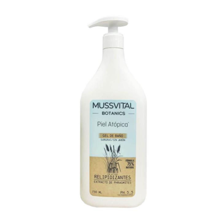Mussvital Botanics gel de baño piel atópica sin jabón limpia suavemente la piel reactiva o atópica y le aporta hidratación y calma la irritación.