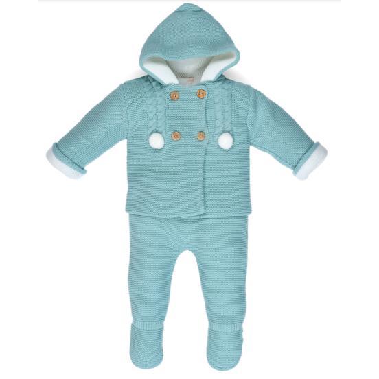 Conjunto de punto 2 piezas para bebé compuesto por chaqueta con capucha detalle pompones y polainas