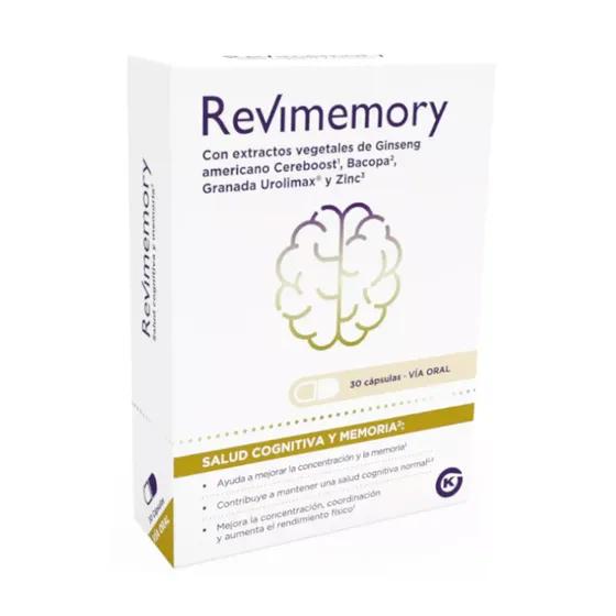 Revimemory de Kern Pharma es un complemento alimenticio a base de extractos vegetales de Ginseng americano (Cereboost®), Bacopa, Granada (Urolimax®) y Zinc. Está indicado para la salud cognitiva y la memoria.