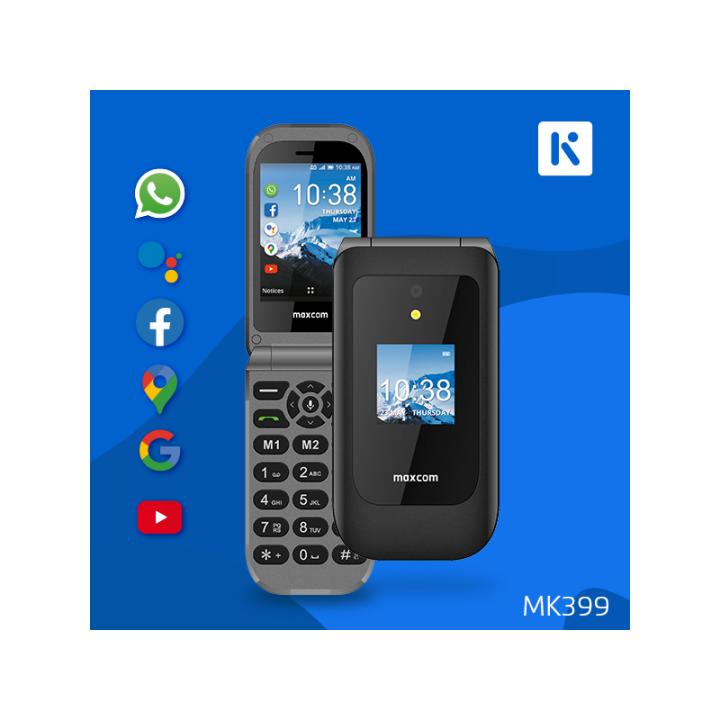El Maxcom MK399 és un teléfono clásico con funciones de smartphone. Gracias al sistema operativo KaiOs nos permite tener aplicaciones como Whatsapp, Facebook, Google Maps o Youtube. Un teléfono plegable con pantalla de 1,4" TFT y grandes teclas. Cuenta con 3 memoria directas y botón SOS. Acepta una tarjeta Micro SD de hasta 32GB. Tiene una cámara de 2Mpx.Y cuenta con GPS y navegación por internet 4G.