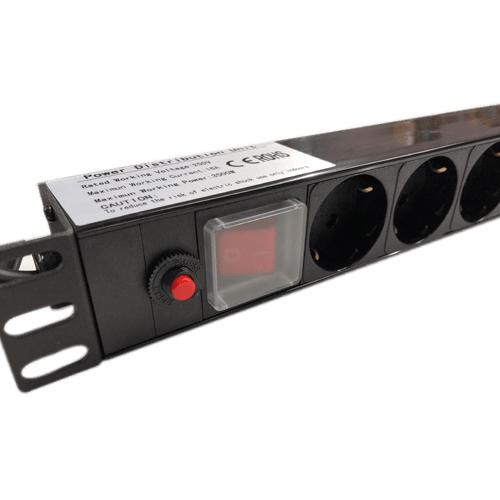Regleta de enchufes de 8 schuko con interruptor y protección para ser utilizada en armario rack de 19" ya que incluye 2 fijaciones metálicas para su correcto montaje
