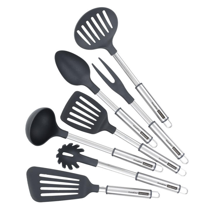 Utensilios para cocinar fabricados de acero inoxidable de alta calidad y, en algunos de ellos, con nylon resistente al calor (210ºC). Son adecuados para guisar, remover, mezclar, cortar y servir con total facilidad. Ideales para todo tipo de baterías de cocina, exclenete para baterías con recubrimiento antiadherente, principalmente los utensilios de cocina con la punta de nylon, porque no dañan la superficie del recipiente. Aptos para lavavajillas. Garantía de 3 años.