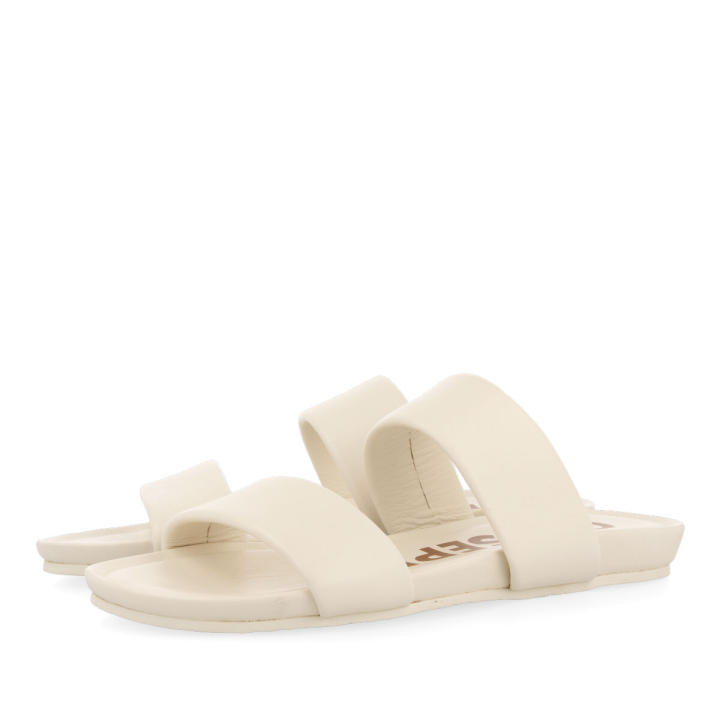 Sandalia plana tipo bio de piel en color off-white. Plantilla de piel suave y acolchada con látex. Piso muy flexible para garantizar un mayor confort. Comodidad y tendencia en un mismo modelo.