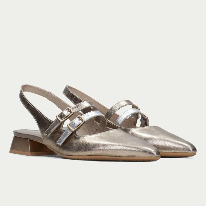 Zapato destalonado para mujer modelo Dali Oro de la marca española Hispanitas en color oro acabado en punta elaborado en piel. Su diseño de 2 tiras finas paralelas con cierre de hebilla en el empeine, permite un perfecto ajuste al pie. Este zapato incorpora la tecnología Triflow, un triple almohadillado que genera un efecto acolchado en la pisada. La altura del tacón es 2,5 cm. Fabricado en España