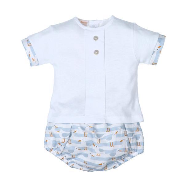 Conjunto corto bebé Gaviotas compuesto por cubrepañal con estampado y camiseta manga corta cuello redondo detalle botones