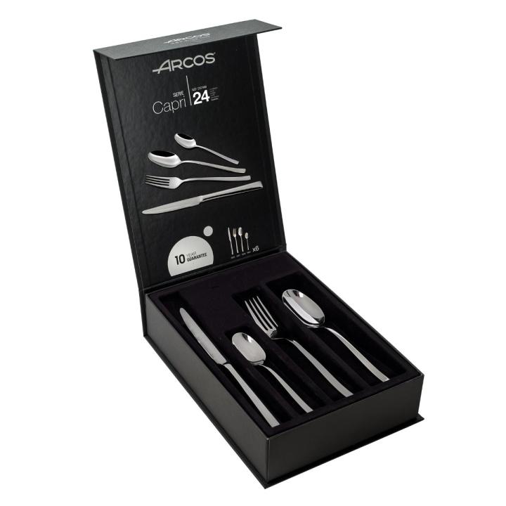 ARCOS Juego de Cubiertos de 24 Piezas para Mesa. Cubertería Completa para 6 Personas. Set de 6 Cucharas, 6 Cuchillos, 6 Tenedores y 6 Cucharas de Postre. Serie Capri. Color Plata
