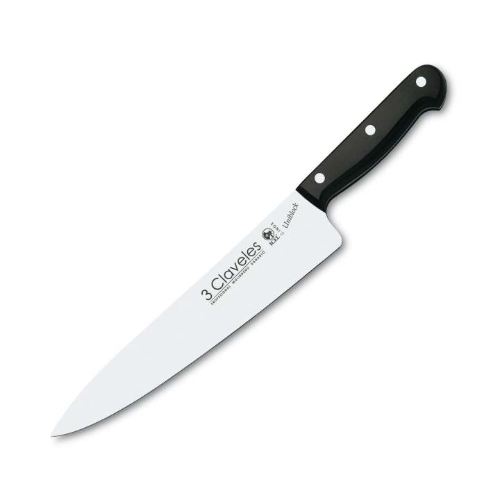 Cuchillo profesional 3 Claveles Uniblock ref. 1166 fabricado en acero inoxidable molibdeno vanadio con un corte perfecto y duradero. Mango de POM (polioximetileno) negro ensamblado con tres remaches, que le aporta elegancia a la vez que ergonomía y comodidad.