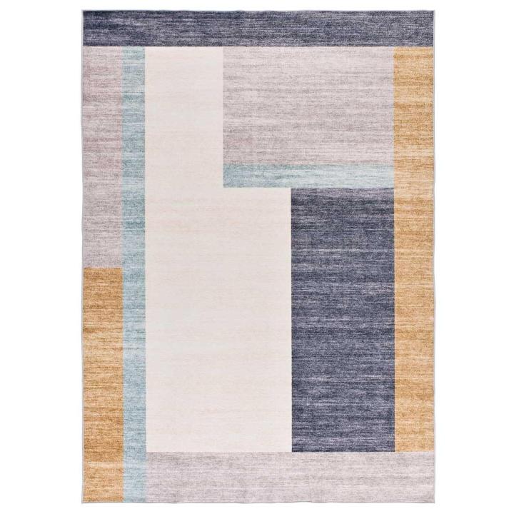Renueva tu espacio con nuestra alfombra CLASS geométrica impresa en tonos de azul, naranja y crema. Los diseños geométricos con dibujos cuadrados y rectangulares añaden un toque moderno y único a cualquier habitación. Descubre cómo esta alfombra geométrica puede realzar la estética de tu hogar con estilo y confort!