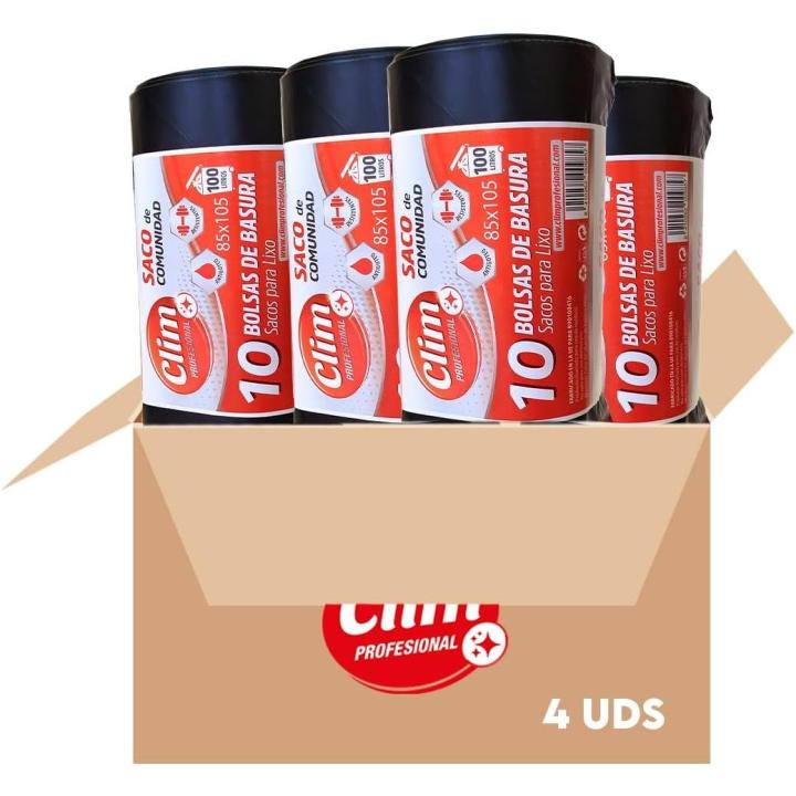 Bolsas de basura para cubos de comunidad en color negro de tamaño 85x105 cm y 100 litros de capacidad. Pack 4 rollos de 10 unidades de bolsas de basura de Clim Profesional. Con sellado antigoteo, ideales para recoger todo tipo de residuos con cubos o contenedores de hasta 100 litros de capacidad. Galga 130