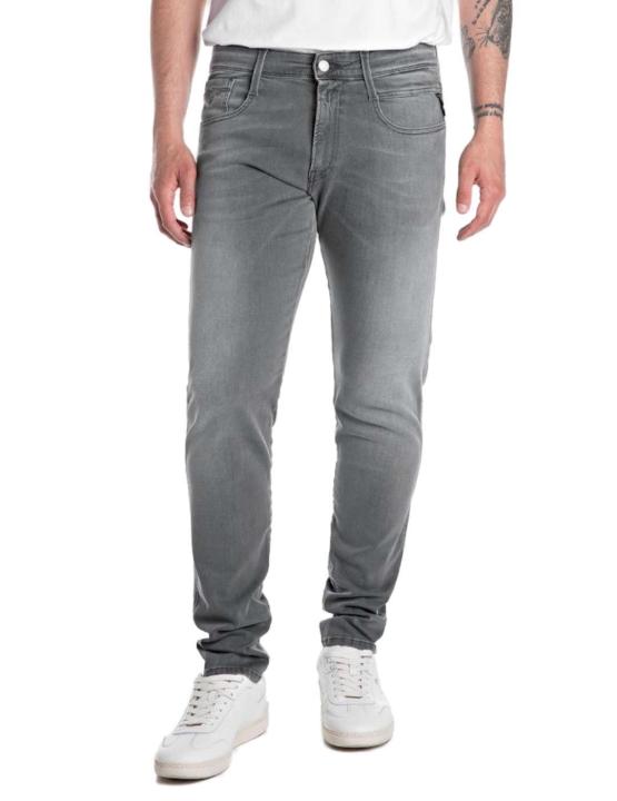Vaquero Replay gris. Tiro medio, cierre de botón y cremallera, cinco bolsillos y trabilla para el cinturón. Parche de branding bordada en parte trasera de la cadera. Corte de la pernera slim.