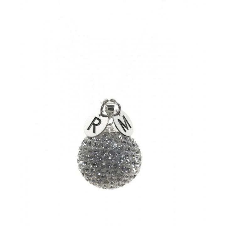 Aquí tenemos un precioso amuleto Llamador de Ángeles realizado en Plata de ley con cristales blancos y personalizado con dos chapitas donde podemos grabar las iniciales que tú quieras. (No incluye cadena).