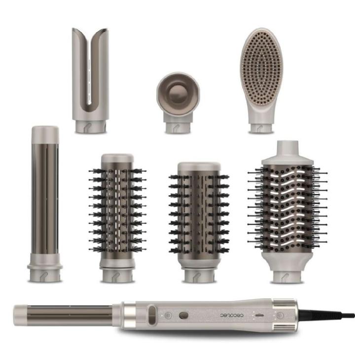 Disfruta de la versatilidad total con el CeramicCare 8in1 AirGlam Gyro Champagne, que te permite alisar, rizar y moldear tu cabello con facilidad, adaptándose a cualquier estilo que desees.