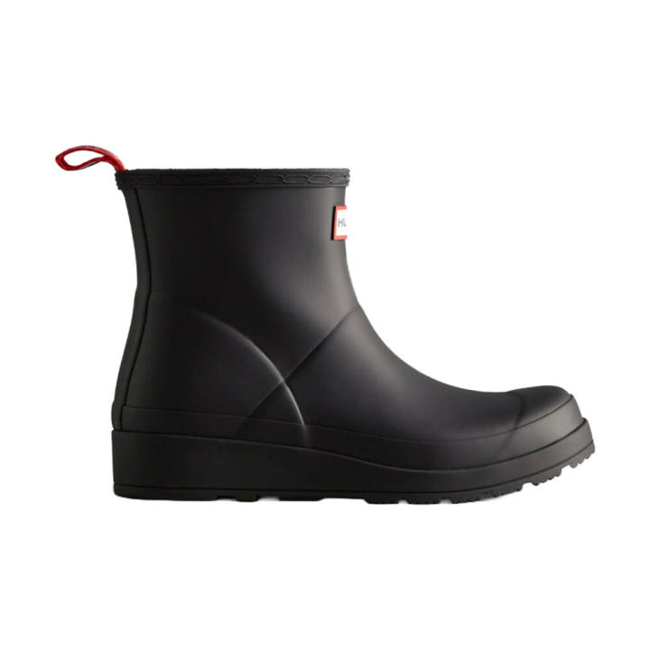 Botas Negras Hunter Boots Play Short Wellington BlackDescripciónBotas Wellington cortas Play para mujerResumen de talla/ajuste: calza un poco más grande, calce regular. Si estás entre dos tallas, se recomienda elegir una talla menor.Simplificando el diseño icónico de la bota Original, la bota Play ofrece una silueta dinámica con una suela de plataforma más plana para máxima comodidad y versatilidad. Elaborada con caucho natural de la más alta calidad, esta bota de agua para mujer es 100 % impermeable. Esta bota corta negra, que apenas roza la parte superior del tobillo, tiene una altura elegante que complementa el estilo urbano, el estilo festivalero y todo lo demás, para que puedas jugar a tu manera.Recomendamos que todas las botas Hunter se usen con calcetines para proteger la piel del usuario del contacto con el caucho.EspecificaciónMaterial Material de acabado Lengüeta de tiro: 100 % nailon Material de revestimiento Forro: 100% poliéster Material Material: 100% cauchoCaracterísticas Vegano certificado Impermeable Hecho a mano con caucho natural. Forro de poliéster Rediseñado para una sensación de ligereza Suela moldeada con la marca Hunter Lengüeta para facilitar la entrada del pie.