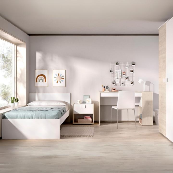 Si necesitas decorar la habitación de tu hijo o hija de una manera práctica, sencilla y minimalista, este conjunto modelo Top Pack 2 es justo lo que necesitas. Se trata de un completo conjunto formado por una cama de 90x190 cm, una mesita de noche con cajón y compartimento inferior, un amplio escritorio ideal para estudiar o situar el ordenador y un amplio y completo armario formado por 3 compartimentos, una barra para colgar y un estante superior donde poder organizar y almacenar toda la ropa, zapatos y objetos que desees.
