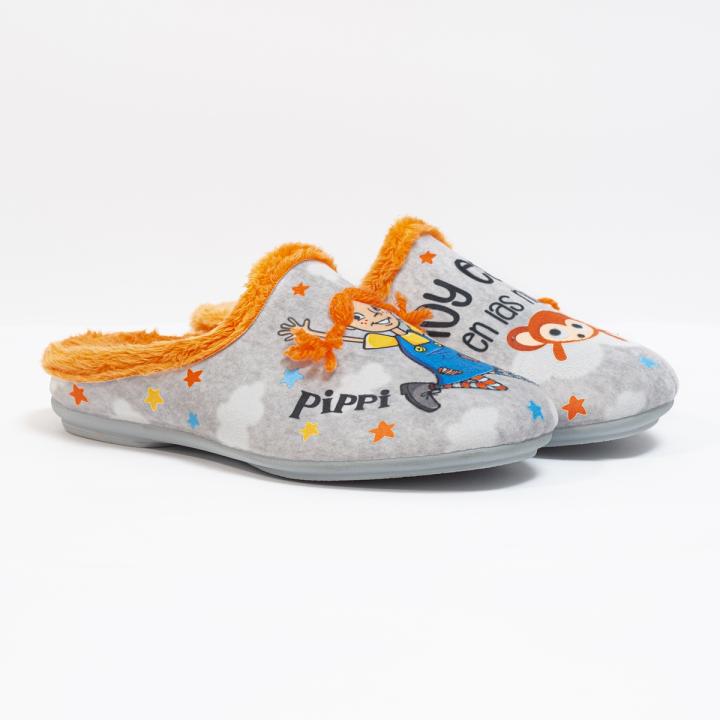 Zapatilla de casa para mujer modelo 1373 de la marca española Vulca-Bicha destalonada y con punta cerrada, fabricada en un tejido cálido y suave en color gris perla, con una llamativa estampación en color naranja que nos recuerda a Pippi Calzaslargas. Su suela es de caucho natural, flexible,antideslizante y tiene plantilla extraíble. Fabricado en España.