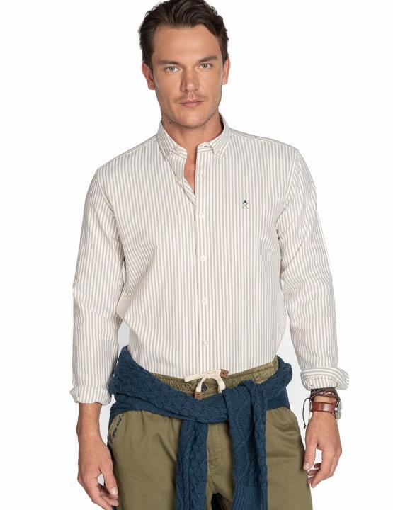 Camisa Harper and Neer modelo Mediterráneo, diseñada con rayas verticales en color verde y blanco. Logo de la marca en el pecho y botones en la parte delantera. Es una camisa básica, que va bién con todo, ya que, además de ser elegante es apropiada para una ocasión formal o para el día a día.