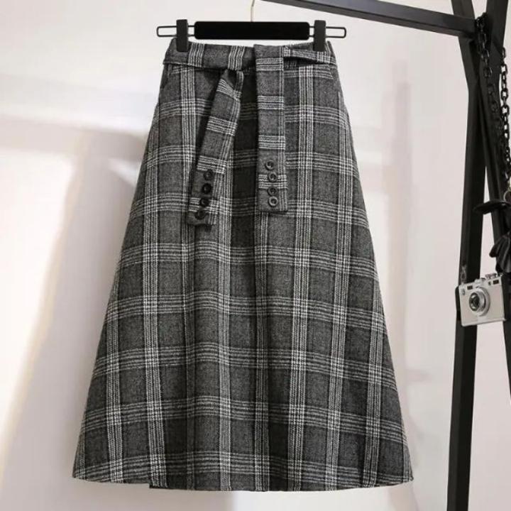 adopte la elegancia atemporal con la falda de corte A vintage a cuadros de color caqui, perfecta para quienes aprecian la moda retro.