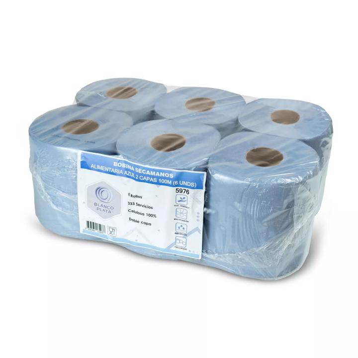 BOBINA PAPEL SECAMANOS 100M 100% CELULOSA DOBLE CAPA COLOR AZUL