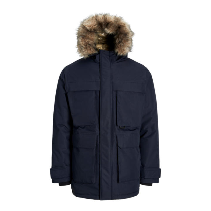 Anorak con capucha con pelo desmontable de manga larga. Cierre con cremallera y corchetes. Seis bolsillos.