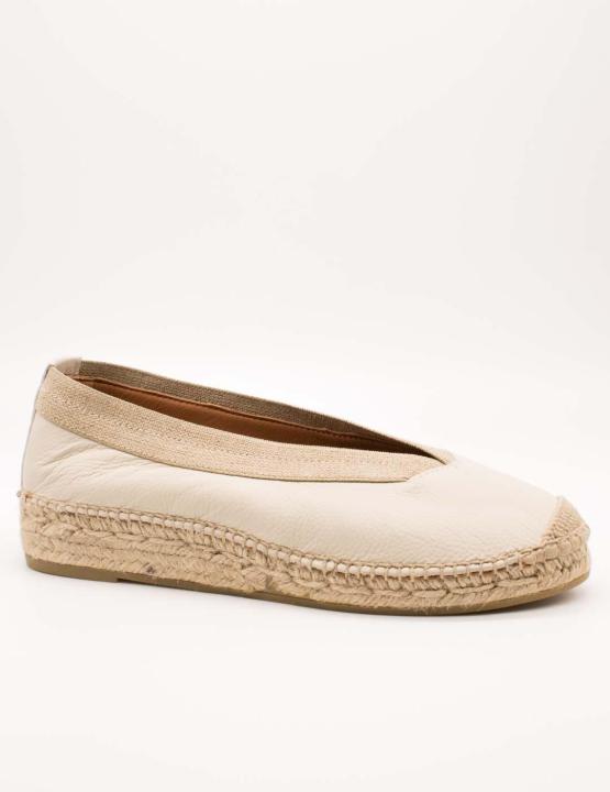 Alpargata de Mujer de la marca Viguera modelo 2225 fabricada en una combinación de piel y textil de color nata Interior en piel y textil. Piso de goma antideslizante con cuña de 3,5 centímetros y plataforma de 2 centímetros.